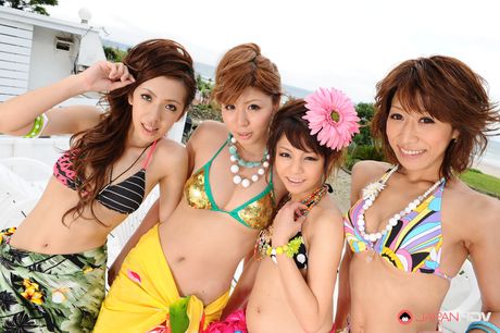 Japan HDV: Lusty hot girls pose in group in their bikinis and have fun on the set
