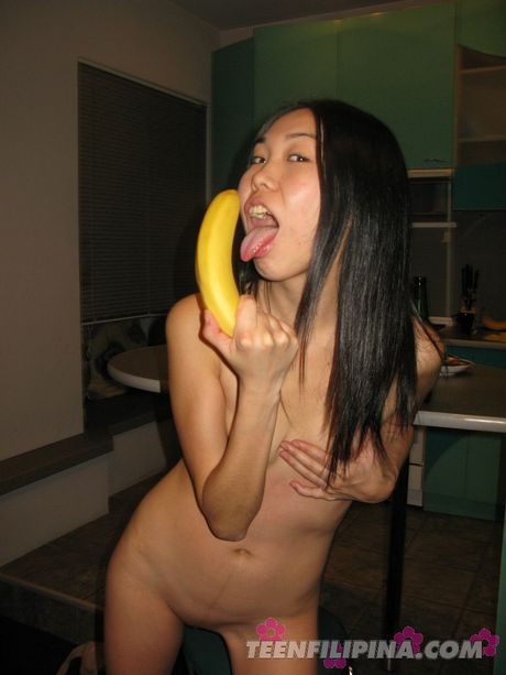 Teenfilipina.net: Skinny Asian girlfriend toying her pussy with a dildo in the kitchen